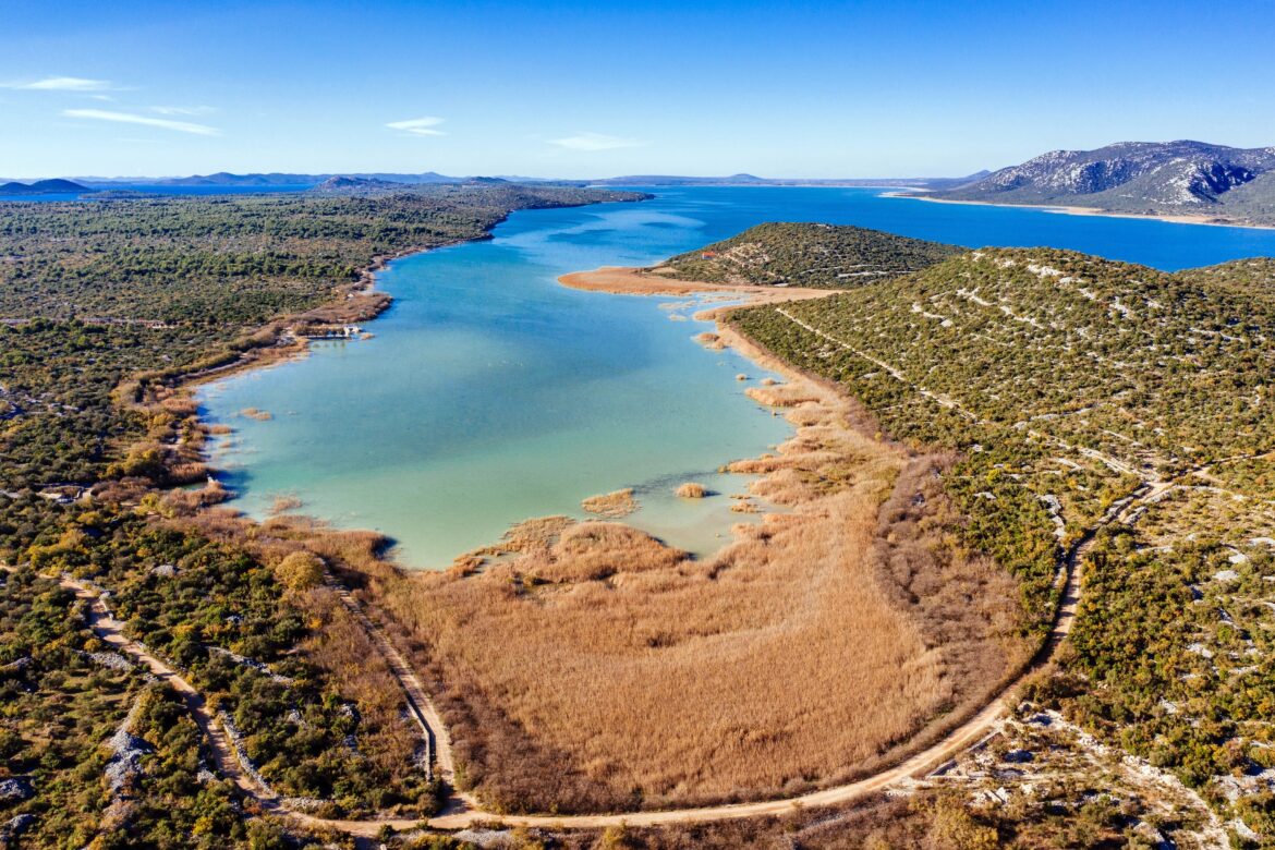 The lake is connected to the sea by the historic Prosika Canal, dug in 1781, which regulates the water level and creates a unique mixture of fresh and brackish waters. A panoramic trail runs along the coast, about 40 kilometers long, ideal for cyclists and walkers, while educational trails and observation posts allow for quiet bird watching. The Kamenjak viewpoint offers one of the most famous Dalmatian views – simultaneously of the lake, Ravne Kotari, the Kornati Islands, and the Adriatic blue.